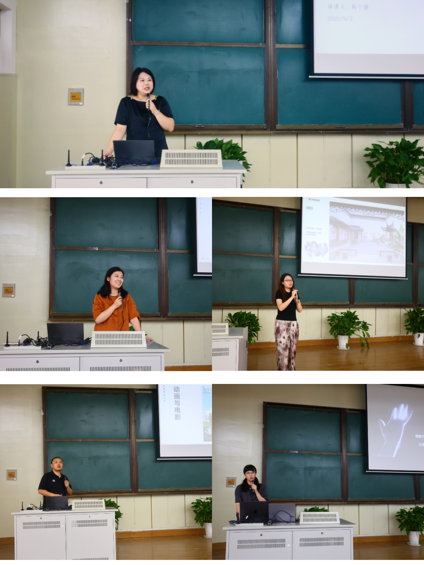 陈宁静、芮潇、刘晓青、张庆、陈晓青五位老师分别就建筑学、环境设计、风景园林、数字媒体艺术和视觉传达设计专业进行了系统介绍。陈宁静老师以古今建筑演进为主线,强调了建筑既是空间的塑造,更是文化、技术与艺术三者的深度交融与表达;芮潇老师通过光影、色彩与肌理等实际案例,阐释了环境设计如何借助材料语言与空间动线;刘晓青老师以中式美学与生态实践为双重视角,引导学生思考风景园林如何协调自然生态与公共需求;张庆老师结合虚拟现实、人工智能及交互技术等前沿应用,展现了数字媒体艺术在沉浸体验与智能创作中的无限可能;陈晓青老师通过系列案例,展现了视觉传达设计在文化、技术与创新上的多维特质。