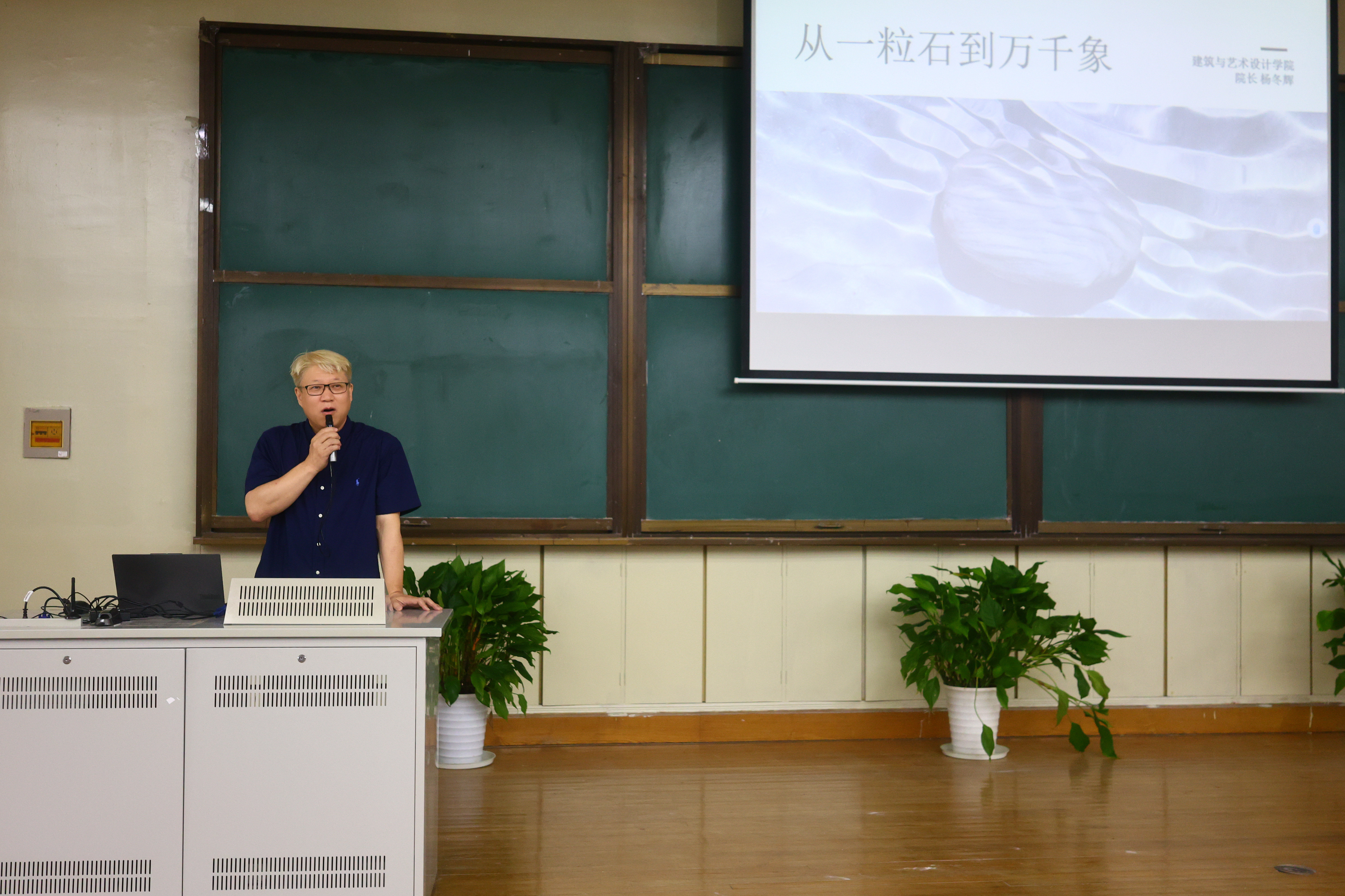 杨冬辉常务副院长首先向新生介绍了学院的办学历史、各专业发展和建设成果,并以“从一粒石到万千象”为主题,为新生带来了一堂生动的专业启蒙课。杨院长强调,这些作品不仅体现了学院“艺术为基、空间与数字双轨并行”的教学理念,同时也展现出学生跨界整合、回应现实的能力。他鼓励2025级新生以“一粒石”的专注与沉淀,在未来四年的学习生活中成长为能塑造空间、融汇媒介、创造未来的设计人才。